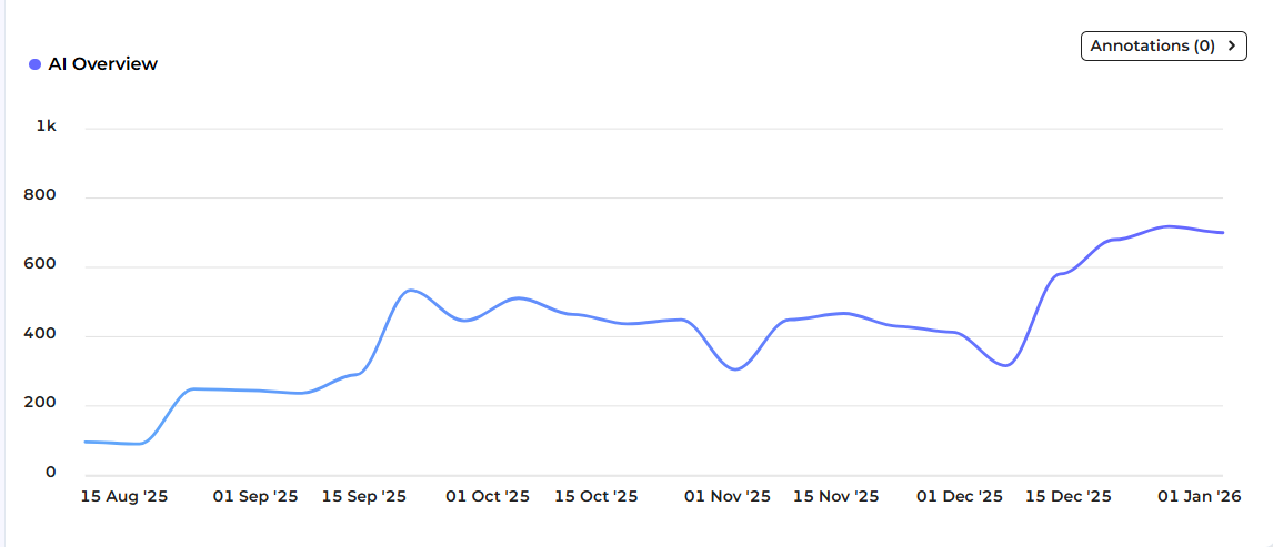 - Track changes in AI Overview keyword visibility over time and quantify improvements in AIO presence.