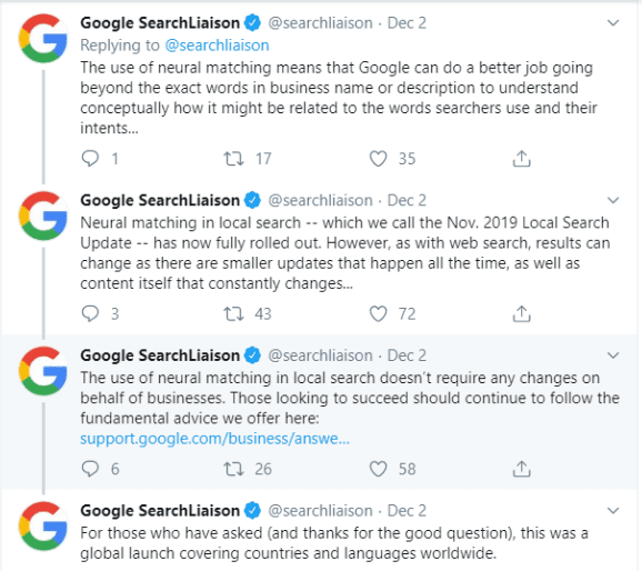 The update was announced by Google Search Liaison on Twitter on Dec 2, 2019, at 12:10 PM ET Monday:
