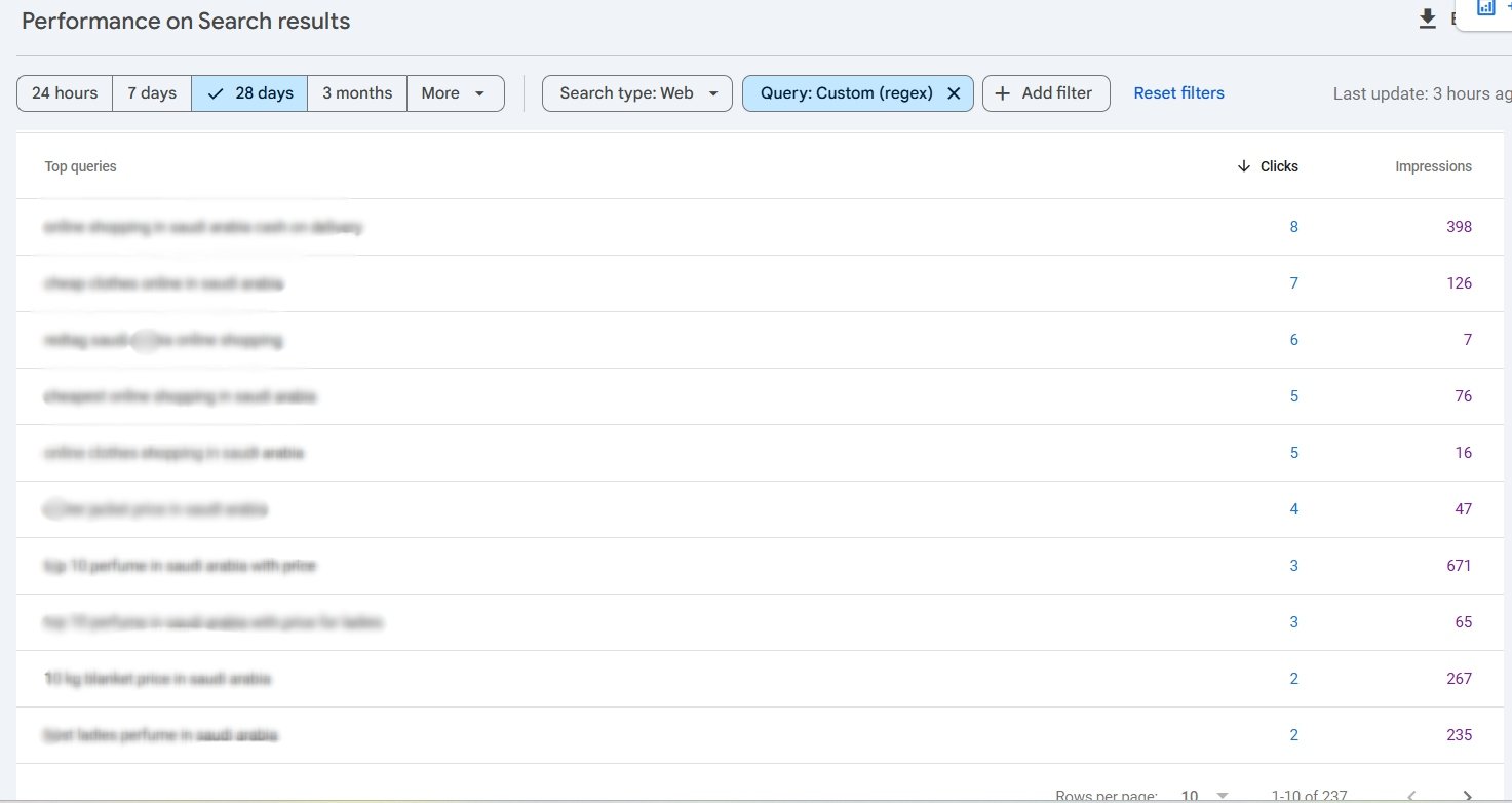 Review the filtered queries and focus on those with clear intent. Prioritize queries with consistent impressions and average positions between 8 and 30, as these often represent strong optimization opportunities.