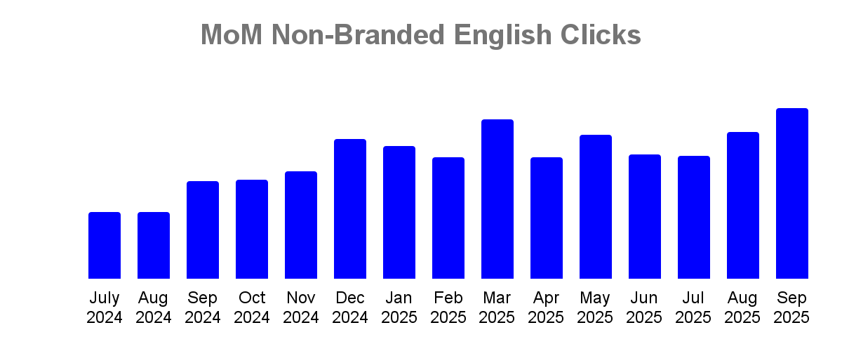 The English market experienced stable, strategic growth driven by improved ranking stability, metadata optimization, and stronger relevance signals across collections and PDPs.