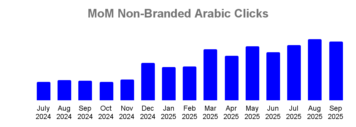 Arabic continues to outperform all segments, delivering the highest improvement in traffic, CTR, and non-brand keyword performance — reaffirming it as the top growth driver.