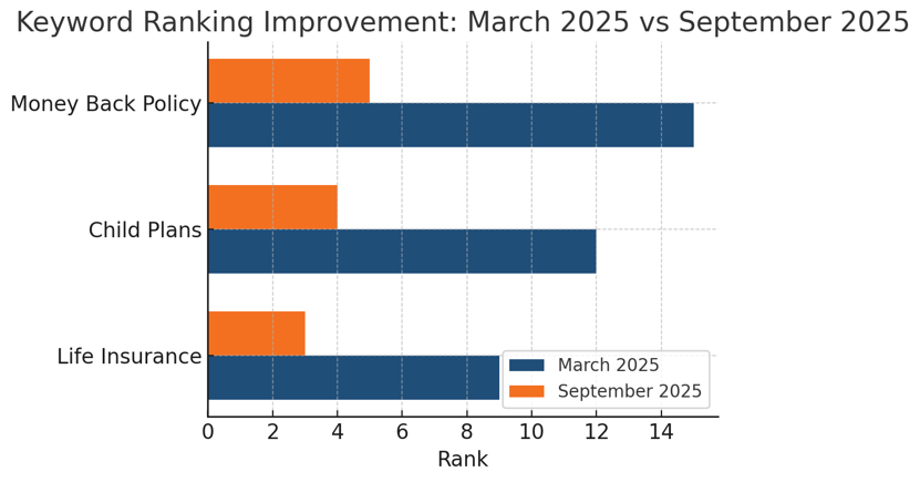 - Significant ranking improvements were observed for keywords such as “Money Back Policy,” “Child Plans,” and “Life Insurance,” highlighting the effectiveness of the link-building strategy.