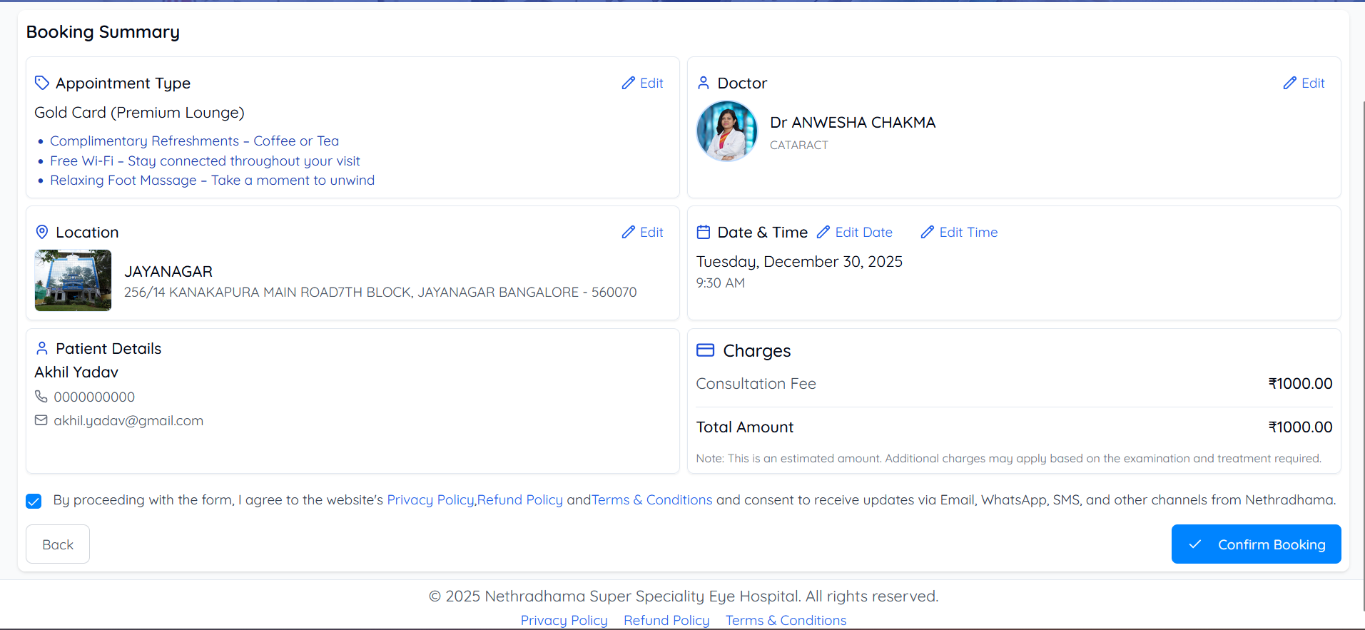Patients review and then confirm their consent to the Privacy Policy, Refund Policy and Terms & Conditions, along with receiving updates via Email, WhatsApp, and SMS. A single, clear “Confirm Booking” button completes the process and pushes a clean, structured booking to the hospital team.