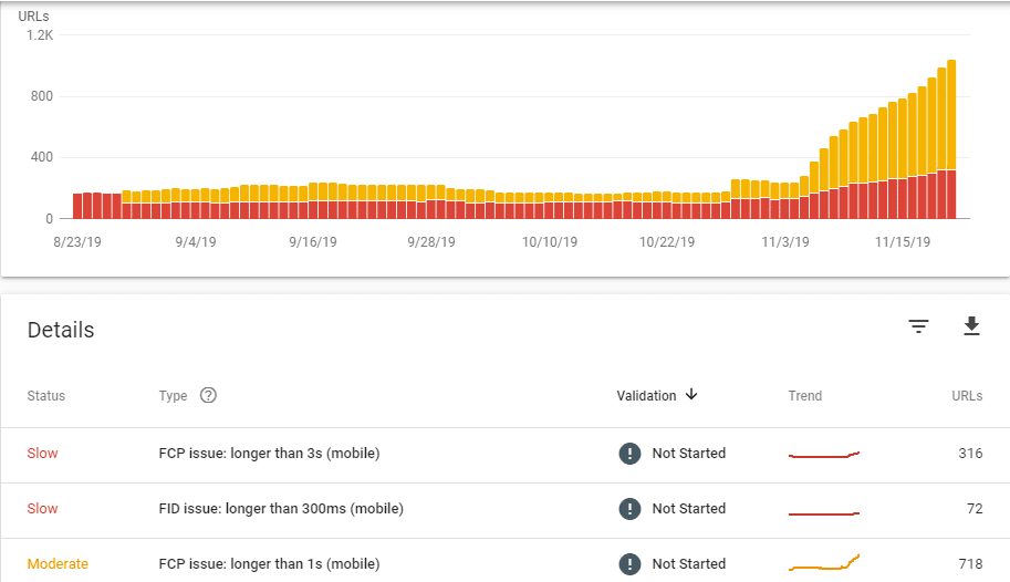 In the above example, 316 URLs are shown as slow as their FCP (First Contentful Paint, i.e. the time taken by the browser to render the first bit of content) is longer than 3 seconds. 718 URLs are shown as being of moderate speed as their FCP is longer than 1 second but less than 3 seconds. For URLs to come under the fast category their FCP should be less than 1 second.