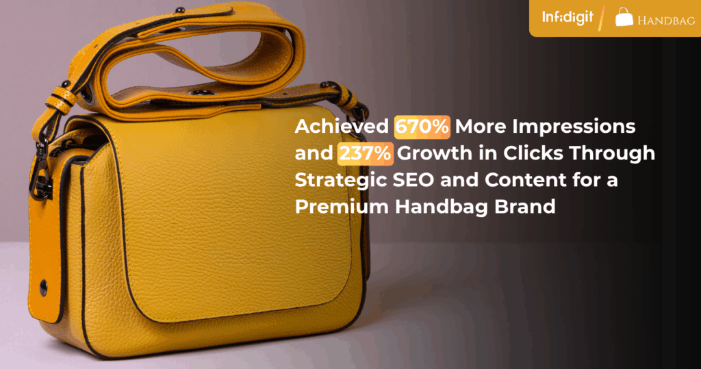 Through a combination of technical SEO fixes, keyword-focused content enhancements, and structural improvements, Infidigit enabled the premium handbag brand to overcome intense competition, boost organic reach, and significantly grow both branded and non-branded traffic. This case study showcases the impact of holistic SEO in unlocking untapped organic growth for fashion e-commerce brands.